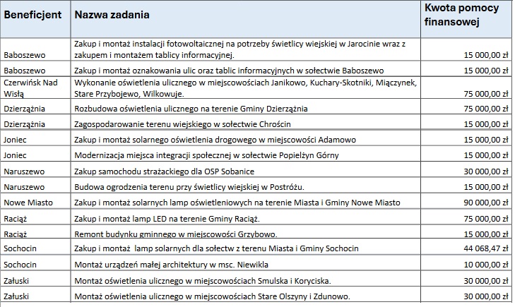 Podkreśla Janina Ewa Orzełowska, członek zarządu województwa mazowieckiego. Wśród beneficjentów znalazły się także gminy z powiatu płońskiego, które otrzymają łącznie 564 tys. zł na realizację swoich projektów. Z pełną listą zadań, które zostaną zrealizowane w ramach programu „Mazowsze dla sołectw” w powiecie płońskim, zapoznać się można poniżej.