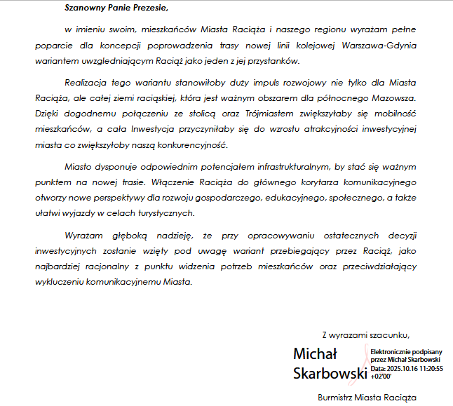 - Wyrażam głęboką nadzieję, że przy opracowywaniu ostatecznych decyzji inwestycyjnych zostanie wzięty pod uwagę wariant przebiegający przez Raciąż, jako najbardziej racjonalny z punktu widzenia potrzeb mieszkańców oraz przeciwdziałający wykluczeniu komunikacyjnemu miasta – pisze do spółki burmistrz.