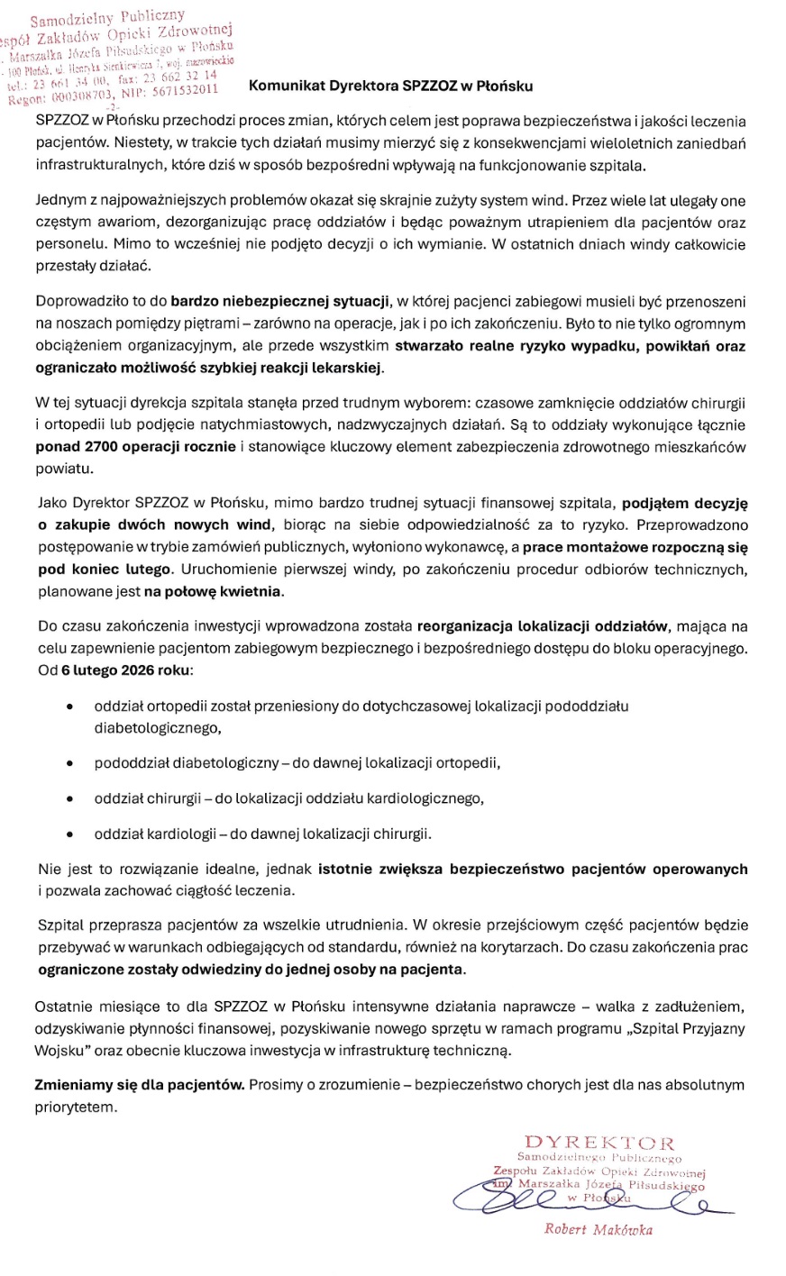 Szpital Powiatowy w Płońsku opublikował oficjalny komunikat dotyczący poważnych problemów infrastrukturalnych oraz podjętych działań mających na celu zapewnienie bezpieczeństwa pacjentów i ciągłości leczenia. Poniżej publikujemy jego pełną treść.
