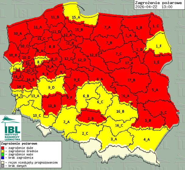 Zagrożenie pożarowe na terenie Polski | dane z 22.04.2026 z godziny 13:00