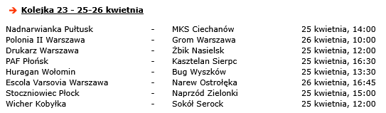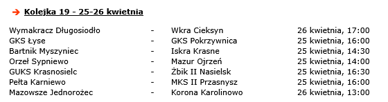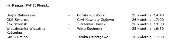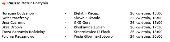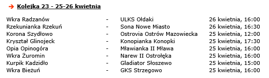 Nie odpoczywa „okręgówka”, której drużyny w środę rozegrały mecze zaległej kolejki. Tu jednak także wyjazdowe spotkania rozegrają ekipy z powiatu płońskiego. Sona Nowe Miasto zmierzy się z Rzekunianką Rzekuń, a lider rozgrywek, Gladiator Słoszewo, zagra z Kurpikiem Kadzidło.